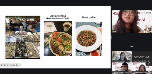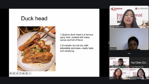 Zeng Xini, a Business English major from the School of International Business and Trade, and Fang Wanyi, a Tourism Management major from the School of Modern Management, introduced the local food cultures of Wenzhou and Quzhou, both located in southeastern China. Through vivid description paired with images, they brought to life China’s rich and diverse food traditions for students from various countries and regions, eliciting enthusiastic responses from the participants. Many international students expressed their interest in experiencing Chinese culture in person in the future.