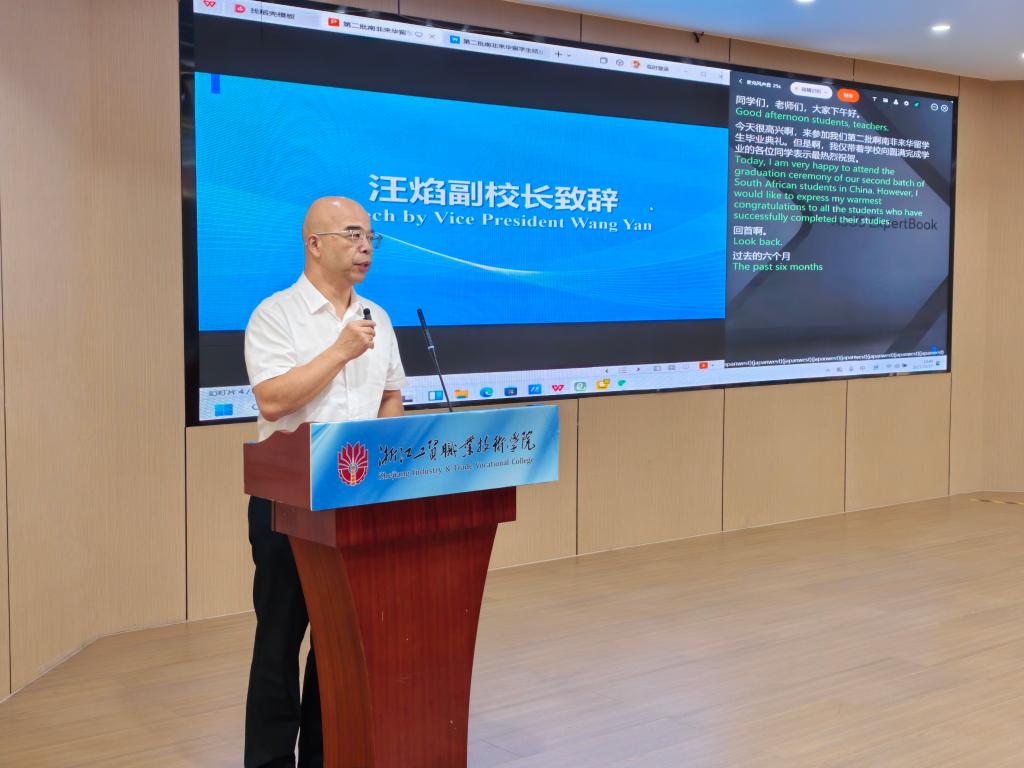 In his speech, Wang Yan extended warm congratulations to the South African students who had successfully completed their studies. He noted that ZJITC has actively integrated domestic and overseas industrial parks and enterprise resources to create a high-quality teaching environment and rich practical platforms for international students. Against the backdrop of economic and trade cooperation under the Belt and Road Initiative, both ZJITC and the South Africa Silk Road School have jointly written a vivid chapter of international industry-education collaboration under the “Park–School–Park” model, a training approach that links learning at domestic digital trade parks, the college, and overseas industrial parks. The students not only systematically studied courses such as Cross-border E-commerce Operations, but also paid field visits to industrial parks including Wenzhou Gucang Digital Trade Park, Wanyang Innovation and Entrepreneurship Park (Wanyang Zhongchuangcheng), and China (Wenzhou) Digital Security Port, and carried out in-depth exchanges with enterprises such as Delixi Group, Wenzhou Shanhai Supply Chain, and Wenzhou Lingsu Robot. By participating in activities such as the China-South Africa cooperation and matchmaking meetings on digital economy and youth entrepreneurship and the China-Africa enterprise partnership events, they expanded their business horizons and created new opportunities for trade and economic cooperation. Meanwhile, some students collaborated with Chinese students in the World Vocational College Skills Competition and won three awards, demonstrating excellent academic achievements. Wang Yan expressed the hope that the students would turn the knowledge, experiences and insights gained at ZJITC into a driving force for personal growth, stronger China-South Africa friendship, and meaningful contributions to society. He also encouraged them to continue to work with Chinese enterprises and ZJITC in the future to pursue broader and deeper cooperation for mutual benefit.