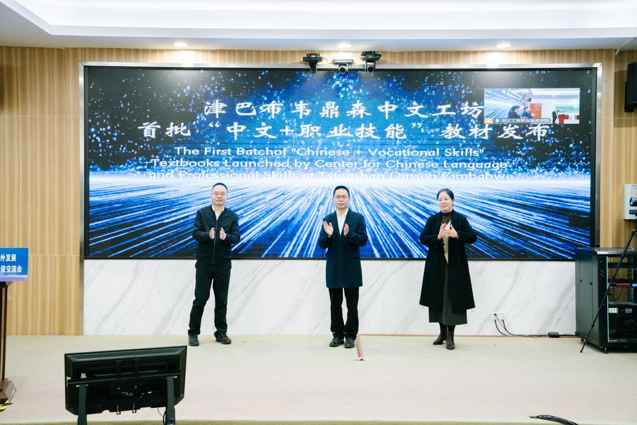 At the conference, President Yu Chuang, Liu Jiuqing, Deputy Director of CNMITC’s Training Department, and Li Guangliang, Director of the Overseas Publishing Department of Higher Education Press, jointly unveiled the first batch of “Chinese + Vocational Skills” textbooks for the Center for Chinese Language and Professional Skills at Tsingshan Dinson in Zimbabwe.