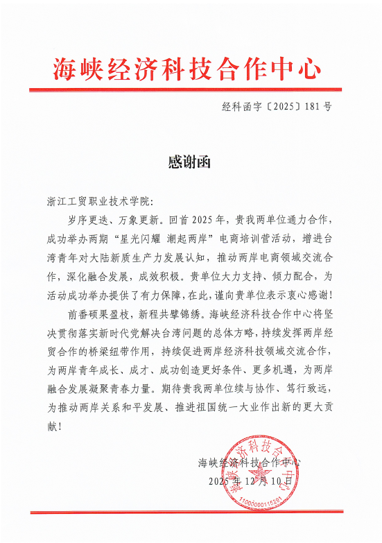 Recently, Zhejiang Industry & Trade Vocational College (ZJITC) received a letter of appreciation from the Cross-Strait Economic and Scientific Cooperation Center (CSESC). The letter highly recognized the college’s outstanding work in successfully hosting two sessions of the “Shining Stars, Rising Tides Across the Strait” E-Commerce Training Camp. It expressed sincere gratitude for ZJITC’s dedicated efforts in event organization, external liaison, logistical support, and publicity. It also commended the college for its positive contributions to enhancing Taiwanese youth’s understanding of the development of new quality productive forces on the Chinese mainland, promoting exchanges and cooperation in the e-commerce sector, and advancing integrated development across the Strait.