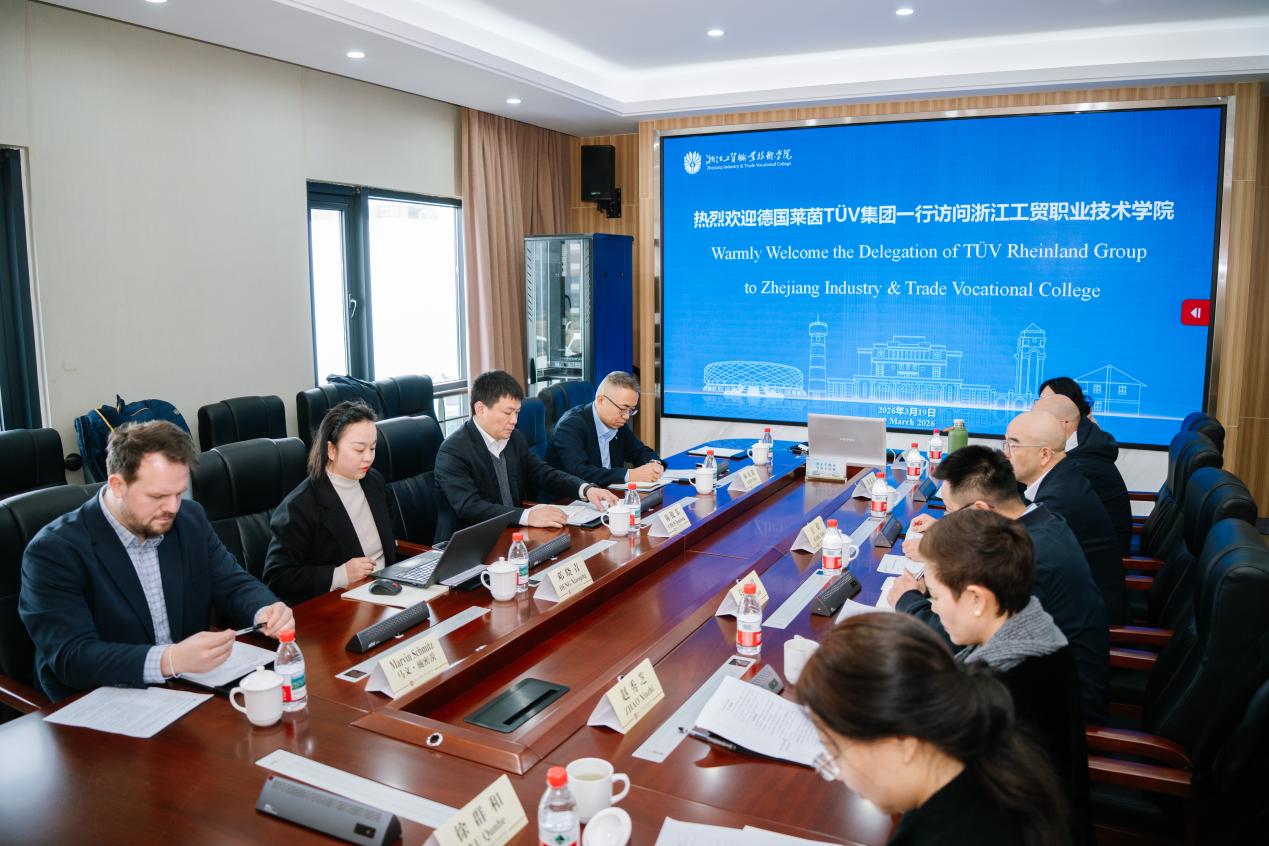 On March 19, Zhejiang Industry & Trade Vocational College (ZJITC) and TÜV Rheinland Group jointly hosted a seminar on the CEAIE‑TÜV Rheinland International Project for Industry‑Education Collaboration and Empowerment of High‑Level Higher Vocational Colleges. Chen Jundong, General Manager of Personnel and Business Support Services, Greater China at TÜV Rheinland Group, led a delegation to ZJITC for a visit and exchange. Wang Yan, Vice President of ZJITC, attended the meeting with other college representatives. Also present were Chen Yibo, General Manager of the Hangzhou Branch of TÜV Rheinland (Shanghai) Co., Ltd., Deng Xiaoqing, Training Consultant, and Marvin Schmitz, Lecturer, of the Zhejiang Region’s Personnel and Business Support Services at TÜV Rheinland Group, as well as heads of ZJITC’s Office of International Cooperation and Exchange, School of Optoelectronic Manufacturing, and School of Artificial Intelligence.