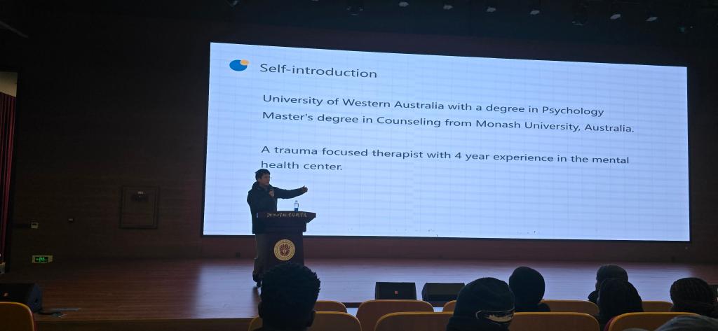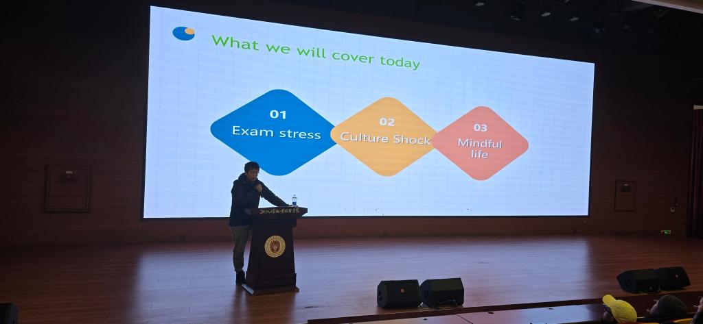 As final exams approach, some international students find themselves facing the dual challenge of academic pressure and cross-cultural adaptation. On January 4 from 1:00 to 3:00 p.m., the School of International Education held a lecture titled “Stress-Free Exams & Smooth Adaptation: Psychological Guidance on Exam Stress Relief and Cross-Cultural Adjustment for International Students” in the lecture hall of Jingting Building at the Oujiangkou Campus. Mr. Ye Zhaixiang, a licensed psychotherapist from Wenzhou Seventh People’s Hospital, was invited to deliver a targeted and practical lecture. He began with warm and accessible language, which quickly built rapport with the audience. The lecture was structured around three core themes: coping with exam-related stress, navigating cross-cultural adjustment, and promoting mindfulness in everyday life.